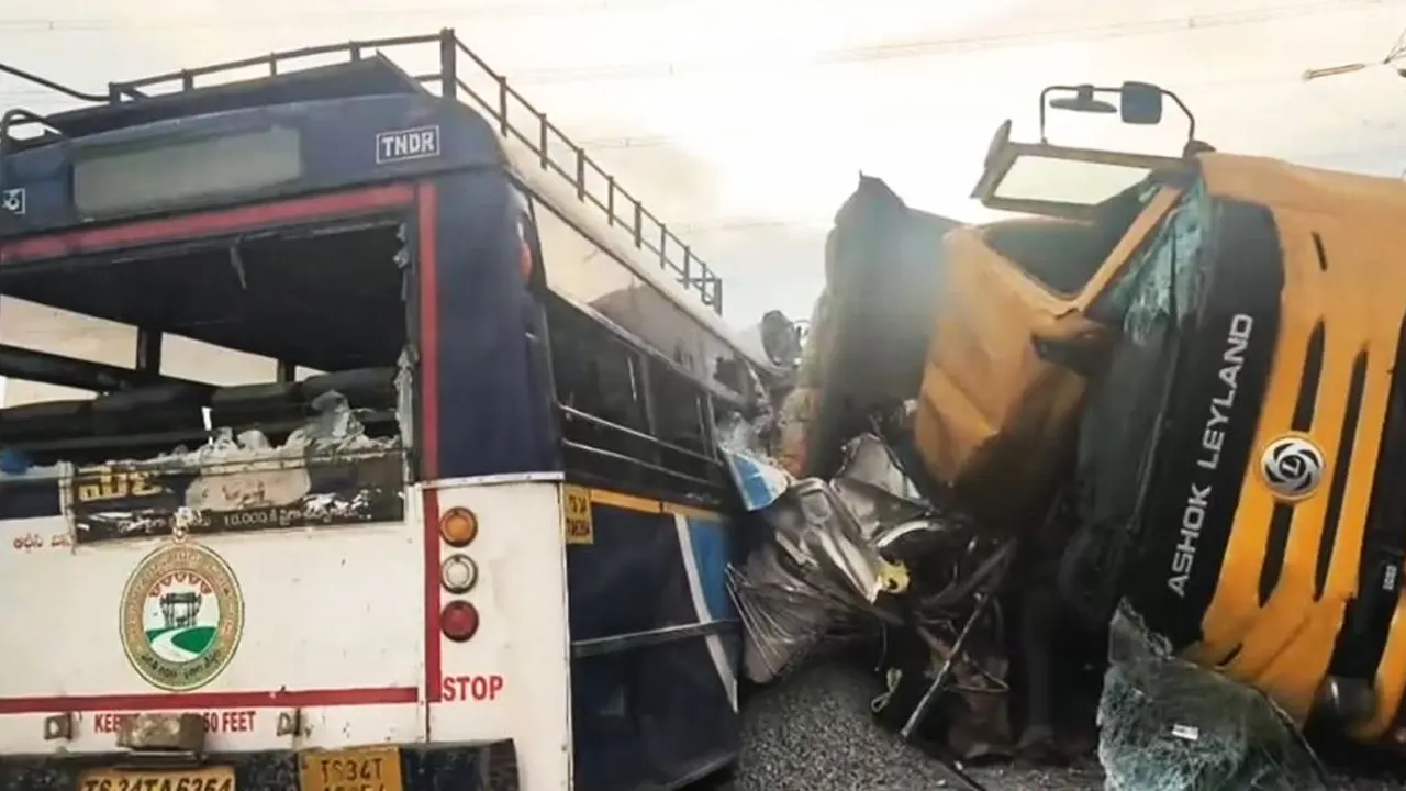 তেলেঙ্গানা পুলিশ সূত্রে জানা গেছে, একটি পাথরবোঝাই ট্রাক মোটরসাইকেলকে ওভারটেক করার সময় বিপরীত দিক থেকে আসা বাসটির সঙ্গে মুখোমুখি সংঘর্ষ হয়। এতে ট্রাকটি উল্টে গিয়ে পাথরগুলো বাসের ওপর পড়ে। ঘটনাস্থলেই বহু যাত্রী নিহত হন।