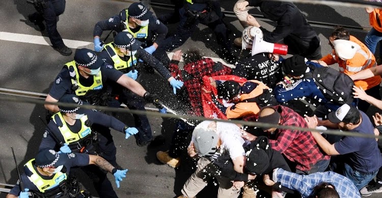 অনুমোদন না নিয়ে লকডাউনবিরোধী বিক্ষোভ করায় অস্ট্রেলীয় পুলিশ মেলবোর্ন থেকে ২৩৫ এবং সিডনি থেকে ৩২ জনকে গ্রেফতার করেছে। মেলবোর্নে সাত শতাধিক বিক্ষোভকারীকে ছত্রভঙ্গ করতে পুলিশ মরিচের গুঁড়া ছিটায়। এসময় বিক্ষোভকারীদের সঙ্গে সংঘর্ষে পুলিশের বেশ কয়েকজন কর্মকর্তা আহত হন। শনিবার (১৮ সেপ্টেম্বর) আল-জাজিরার এক প্রতিবেদনে এ তথ্য জানানো হয়েছে।