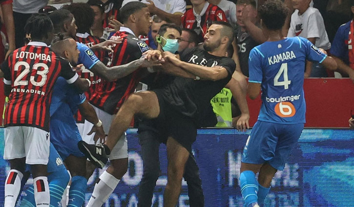ক্যাস্পার ডলবার্গের গোলে দ্বিতীয়ার্ধে এগিয়ে যায় নিস। সবকিছু ঠিকঠাক ছিল। কিন্তু ৭৪ মিনিটে কর্নার নেওয়ার সময় মার্শেই ফরোয়ার্ড দিমিত্রি পায়েটের দিকে বোতল ছুড়ে মারেন নিস সমর্থকরা। তিনি মুখ বুজে সহ্য করেননি। একটি বোতল ছুড়ে মারেন দর্শকদের দিকে। তার সতীর্থরাও তেড়ে যান। তারপরই শুরু হয় হুড়োহুড়ি। নিরাপত্তাকর্মীরাও মাঠে দর্শকদের অনুপ্রবেশ ঠেকাতে পারেননি।