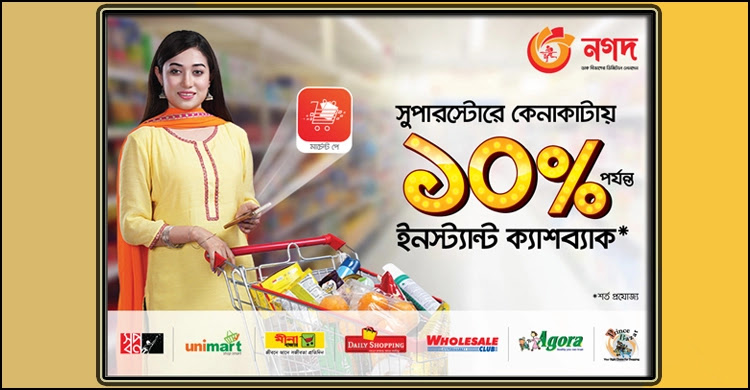 আসন্ন ঈদুল আজহার আগে দেশসেরা সাতটি সুপারশপে কেনাকাটায় ডাক বিভাগের মোবাইল ফাইন্যান্সিয়াল সার্ভিস ‘নগদ’র মাধ্যমে পেমেন্ট করলে ১০ শতাংশ ক্যাশব্যাক পাওয়া যাচ্ছে। সারাদেশে স্বপ্ন, ডেইলি শপিং, প্রিন্স বাজার, ইউনিমার্ট, হোলসেল ক্লাব লিমিটেড, মীনা বাজার এবং আগোরার প্রায় ৩০০ আউটলেটে ঈদের আগের দিন পর্যন্ত এই ক্যাশব্যাক সুবিধা নিতে পারবেন গ্রাহকেরা।